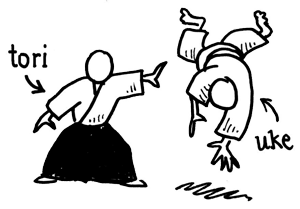 Typically, the instructor shows a technique against a particular attack, and then we pair off and practise that technique, taking it in turns to be the person doing the technique (the tori) and the attacker (the uke) who is being pinned or thrown.